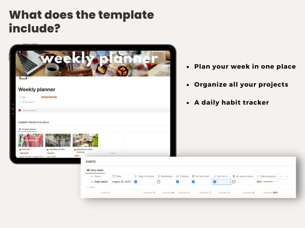 ✨ Goals planner: Track your goals for the week and make sure you're on track to achieve them.