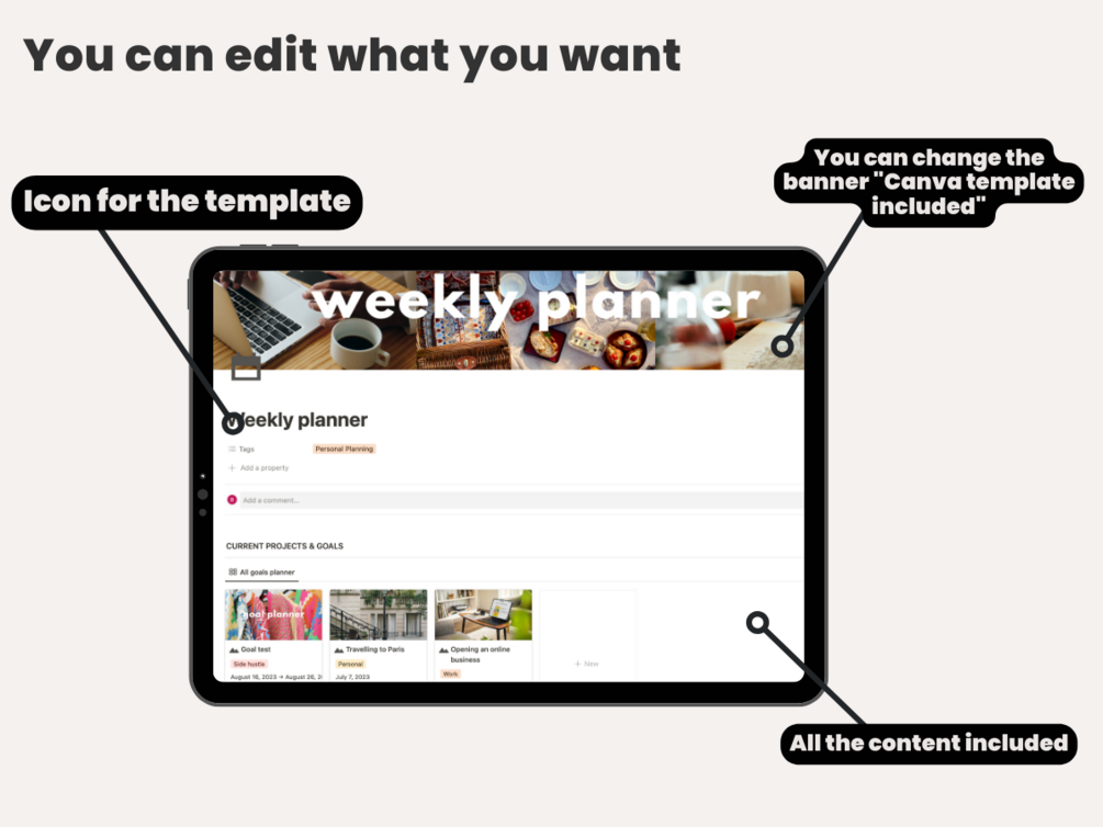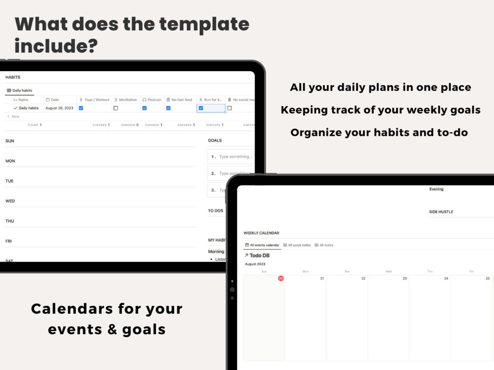 Notion Weekly Planner Template: This all-in-one Notion template is the perfect way to stay organized and on track with your week. It includes a goals planner, daily planner, habit tracker, todos, routines, and weekly planner, all in a sleek and minimal design. The template is also fully customizable, so you can change the colors, fonts, and layout to match your personal style.